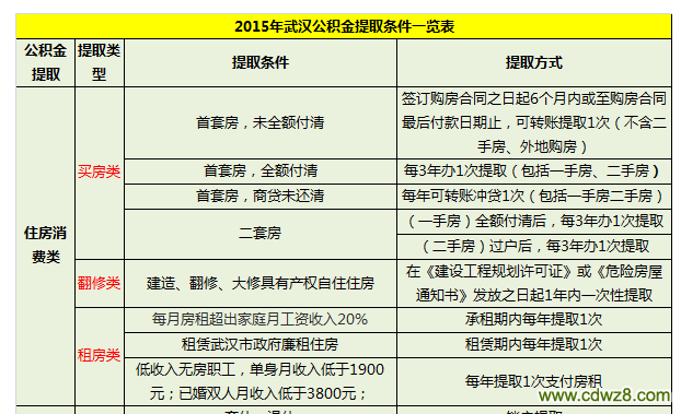 缴费比例。 那么哪些条件下可以提取武汉住房公积金呢,怎么提取?下面yjbys小编为您全面解答! 住房公积金提取可以分为两大类,一类是住房消费类,一类是其他类。住房消费类又分为购房类、翻修类、租房类;其他类中包括辞职退休类、生活困难类;一共有20种条件下可以提取住房公积金。